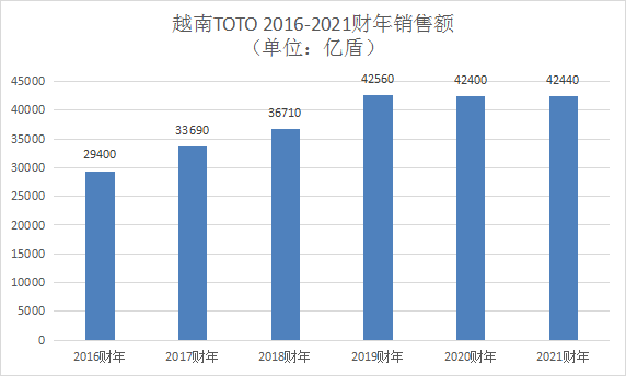 數(shù)據(jù)顯示,TOTO近年在越南的銷售額整體平穩(wěn)。2019財年突破40000億盾(約人民幣12.00億元)后,2020、2021財年均在42000億盾以上,其中2021財年還是越南疫情反彈較嚴(yán)重的一年,這一年TOTO在越南的營業(yè)利潤大幅減少65%。不過,正如TOTO建設(shè)第四工廠不僅為了越南市場,近年越南工廠的產(chǎn)品也大量出口海外市場。以2021財年為例,這一年TOTO在越南的銷售額為42440億盾(約人民幣12.73億元),其中外部顧客銷售額達(dá)到14390億盾(約人民幣4.32億元),占比超3成。