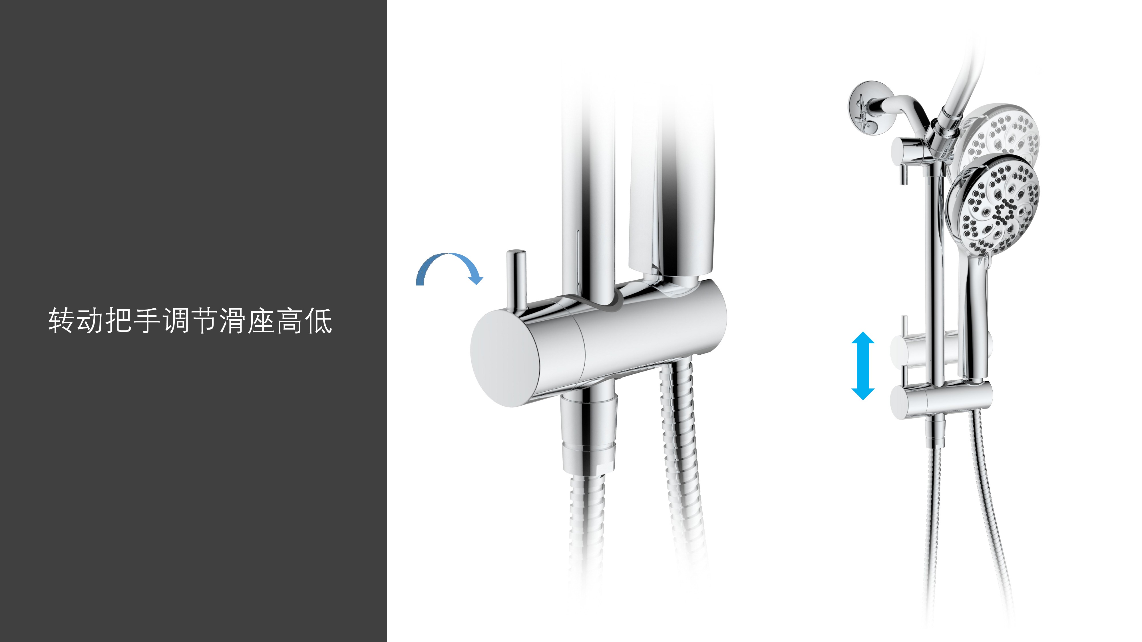上出水彎管套裝;頂噴內(nèi)置球頭,可實現(xiàn)多角度旋轉(zhuǎn)調(diào)整;把手切換頂噴出水、花灑出水;轉(zhuǎn)動把手調(diào)節(jié)滑座高低;8功能出水花灑