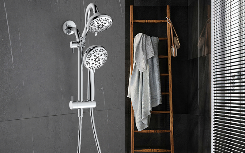 Upper water outlet elbow suit; The top spray has a built-in ball head, which can realize multi-angle rotation adjustment; Switch the handle to top spray water and shower water; Turn the handle to adjust the height of the sliding seat; 8-function water outlet shower